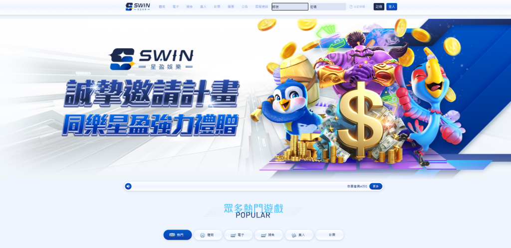 從外觀來看,SWIN星盈娛樂城的介面確實設計得不差,視覺整體是偏科技感+亮麗風,光首頁的動畫跑起來就有種「這網站很專業」的錯覺。但我實際點進去遊戲頁面之後,卻開始有點失望。無論是拉霸、真人娛樂、還是電子遊戲,很多看起來都像是別家廠商的皮換湯再上架。