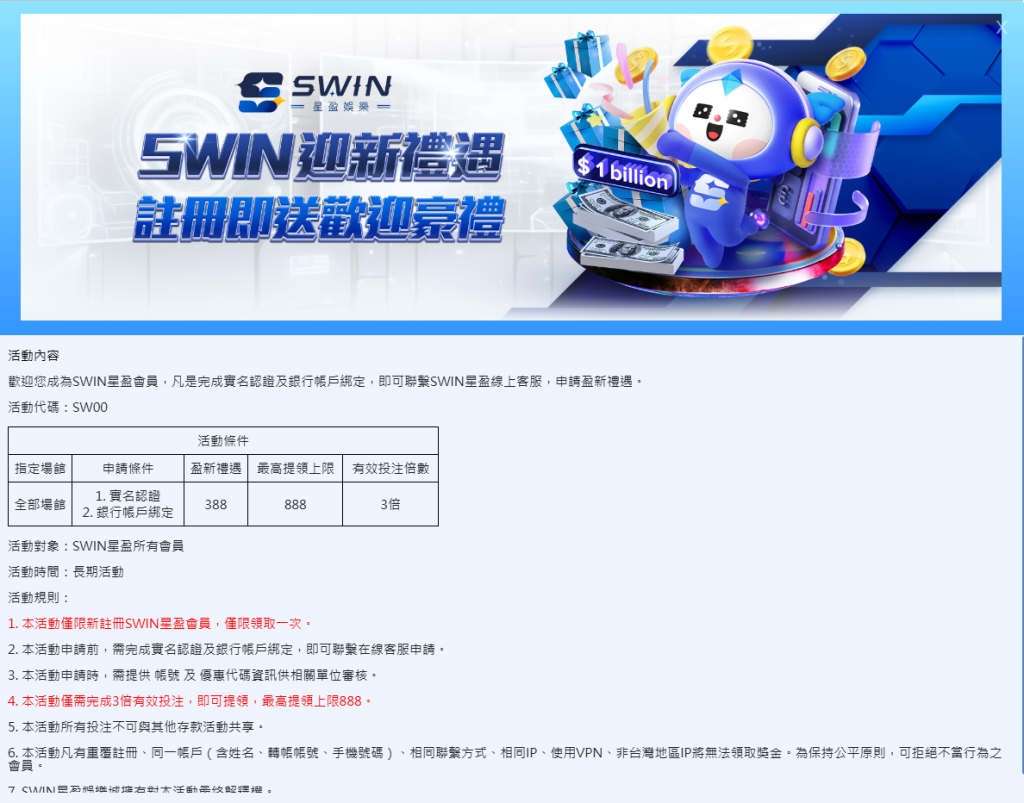 SWIN星盈娛樂城這次主打的「迎新禮遇」活動,看起來是為了吸引新會員而設計的,也就是只要你完成會員註冊、身分驗證與銀行帳戶綁定,就可以申請獲得最多888點的獎勵金。這樣看起來好像很有誠意,但我自己仔細看了規則後,有一種「表面很香、實際要付出不少」的感覺。