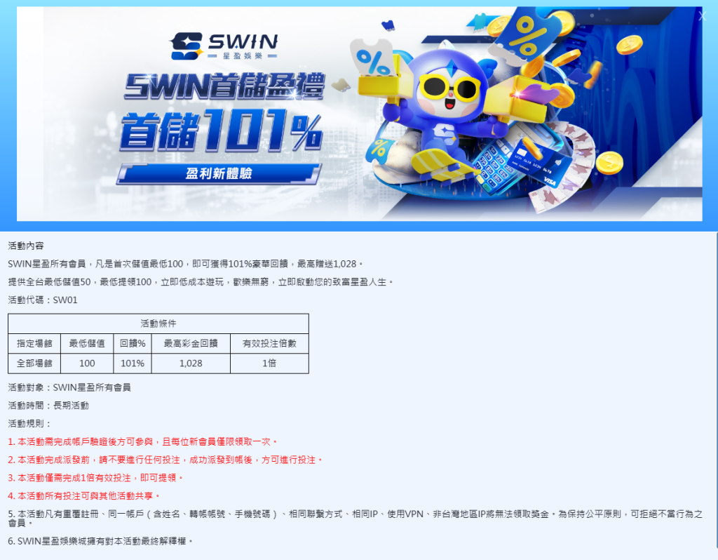剛接觸SWIN星盈娛樂城時,我確實被它整個視覺包裝吸引,藍色系統搭配吉祥物動畫,活動頁面設計得像科技公司一樣有質感,甚至很多優惠看起來也都頗有誠意。但後來我發現,那些所謂的優惠,其實綁了很多「看不見的條件」,像是高倍流水、不合理的驗證程序、還有活動紅利根本領不到的狀況。