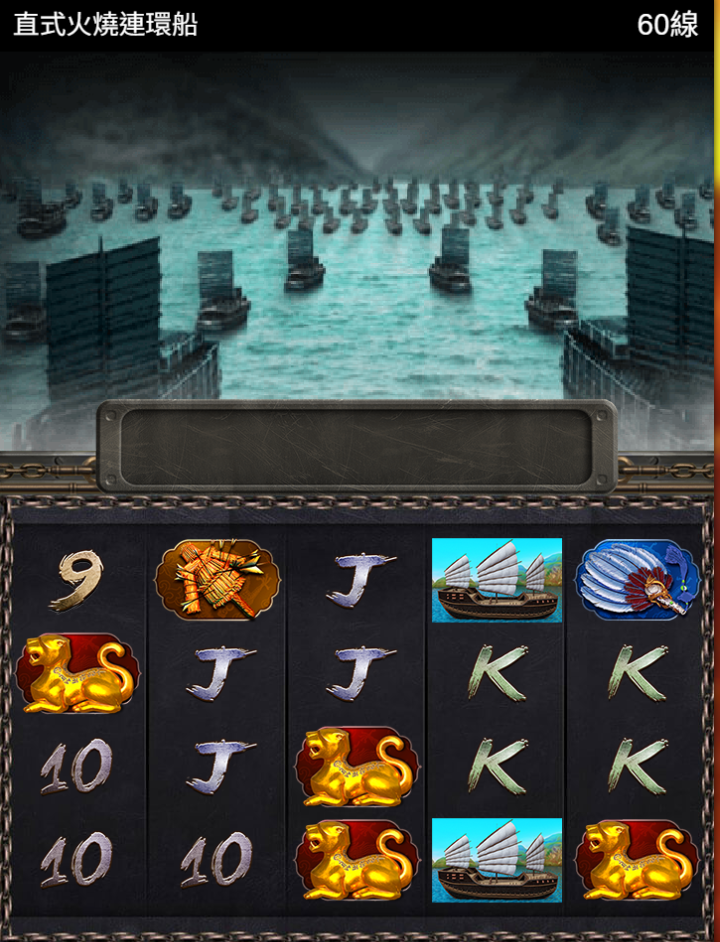 《BE電子-直式火燒連環船》是一款以古代水戰為主題的60線拉霸遊戲,畫面背景壯闊逼真,戰船密佈於山海交界之間,營造出一種一觸即發的戰爭氛圍。玩家彷彿置身於火攻赤壁的壯闊戰場,準備透過轉盤啟動一場聲勢浩大的勝負對決。