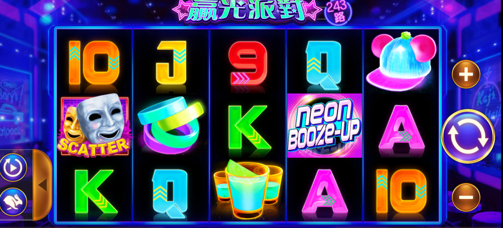 轉輪圖案設計更是亮眼,包括螢光手環、酒杯、帽子、霓虹A~9字母與「NEON BOOZE-UP」標誌性標語,每一格都是派對視覺的延伸。而那張雙面戲劇面具設計的SCATTER圖案,更像是狂歡中象徵神秘驚喜的入口,每次出現都帶來期待與節奏上的轉折。