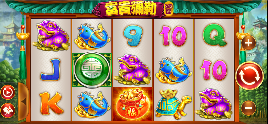 《BE電子-富貴彌勒》是一款充滿東方吉祥氛圍的243線拉霸遊戲,畫面以翠綠竹林與古風建築為背景,結合彌勒佛、錦鯉、金蟾、金元寶等象徵招財進寶的經典元素,打造出一場歡樂又吉祥的致富轉輪旅程。整體色調飽滿鮮豔,每一次轉動都彷彿在點亮財運之門。