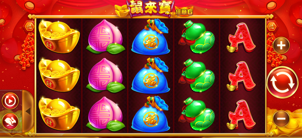 遊戲的圖像設計非常吸引人,金元寶、桃子、財袋等都代表著富貴與繁榮,營造出濃厚的節慶氛圍。螢幕上不時出現的紫色老鼠圖標,成為遊戲的焦點,這不僅是遊戲的標誌性符號,也是觸發高額獎勳的關鍵所在。遊戲的主題結合了中國傳統的財富象徵,無論是吉祥的桃子還是象徵財富的金元寶,都讓玩家在進行遊戲的過程中感受到濃濃的福氣與運氣。
