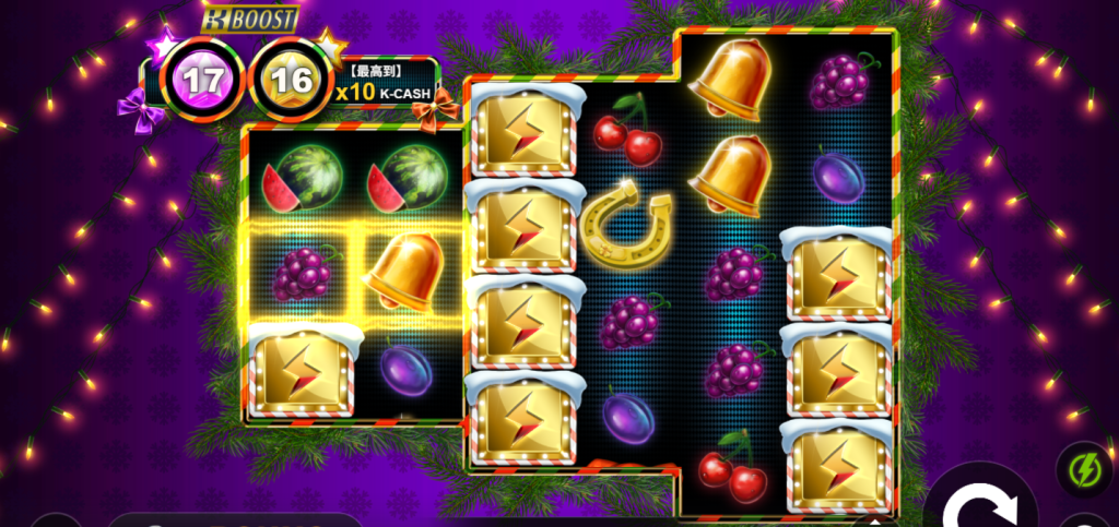 遊戲最大的亮點是上方的BOOST能量槽與K-Cash加乘系統。每當特定符號出現,就能累積能量,並觸發額外的乘數獎勵。特別是看到螢幕中金框閃電方塊連成一線時,整個畫面閃耀著金光,帶來極大的視覺衝擊與中獎快感。我自己覺得,在這樣歡樂又爆金感十足的氛圍下,每一次轉動都像在拆聖誕禮物,充滿了驚喜和期待。