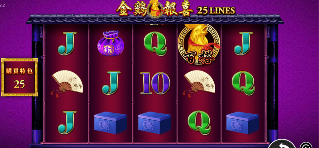 此款遊戲採用25條固定線路設計,讓每一轉都充滿可能性。畫面呈現上極為對稱穩重,紅牆紫紋背景配上瓦片屋簷,強化整體東方建築美學。不僅讓人視覺愉悅,也呼應遊戲主題的「報喜」意象。尤其是在出現百搭金鷄圖騰時,那種金色閃爍的視覺特效令人興奮不已。