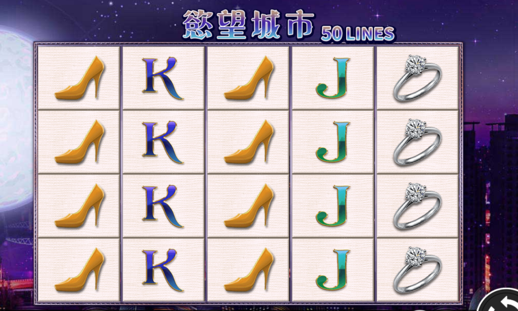 《RSG電子-慾望城市》是一款以時尚夜生活為主題的五輪五列50線拉霸機,遊戲畫面中處處流露出都市夜景的浪漫氣息,從鑽戒、高跟鞋、玫瑰花到香水巧克力,每一個符號都充滿現代都市女性的渴望與奢華。遊戲的配色以紫色夜空為背景,搭配閃耀的圖示與珠寶光澤,讓人彷彿置身於一場時尚派對,視覺上極具吸引力。