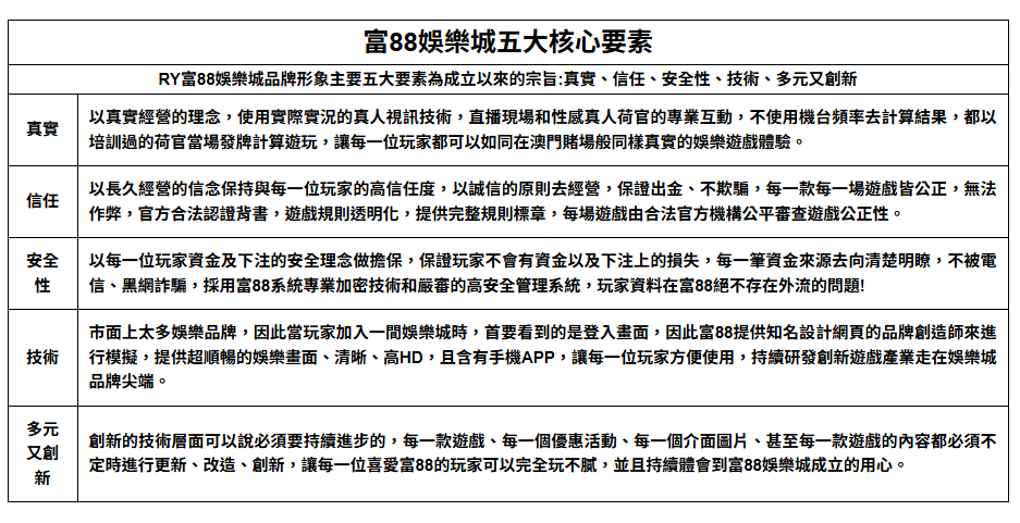 根據平台資料,富88娛樂城明確提出了「五大核心價值」來作為品牌精神指標,包括: