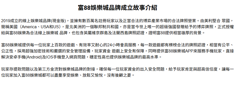 富88娛樂城其實早在2019年就正式成立,是一家有正式授權、有品牌背景、還有合法營運認證的博弈平台,與一般空頭公司開設的詐騙網完全不同。它不只是有多國認證,包括美國簡稱美國(USA)、英國島嶼牌照等,還有與合法金流機構長期合作的紀錄,這些實質的背景都是網路上不會主動說、但值得深究的關鍵資訊。