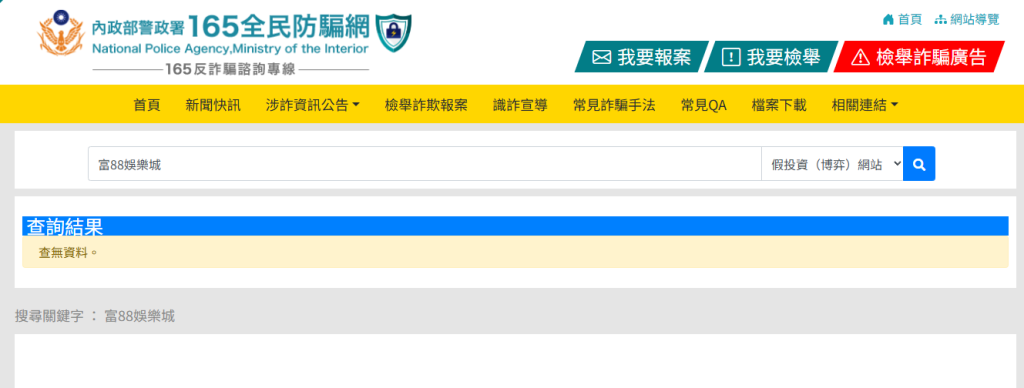 我打開台灣政府官方的「165全民防騙網」,直接在查詢欄位輸入「富88娛樂城」,結果清清楚楚顯示「查無資料」。這代表什麼?代表到目前為止,內政部警政署從未接獲關於富88娛樂城的詐騙通報或列管紀錄。