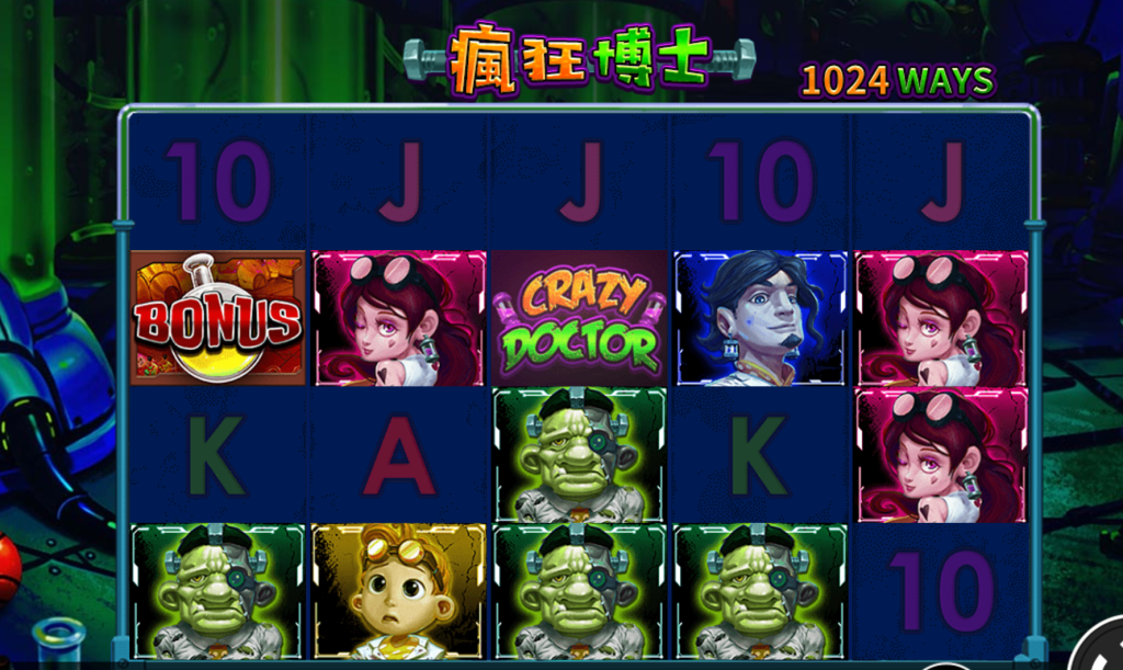 圖示設計部分結合各式角色與科學道具,包括瘋狂博士本尊、紅髮助手、機械改造生物,以及標示著「BONUS」的試管符號。其中「CRAZY DOCTOR」標誌有可能是Wild或特殊功能觸發的關鍵,提升整體變化性與中獎機會。畫面上的角色個性鮮明,搭配動態效果,增添不少視覺衝擊。