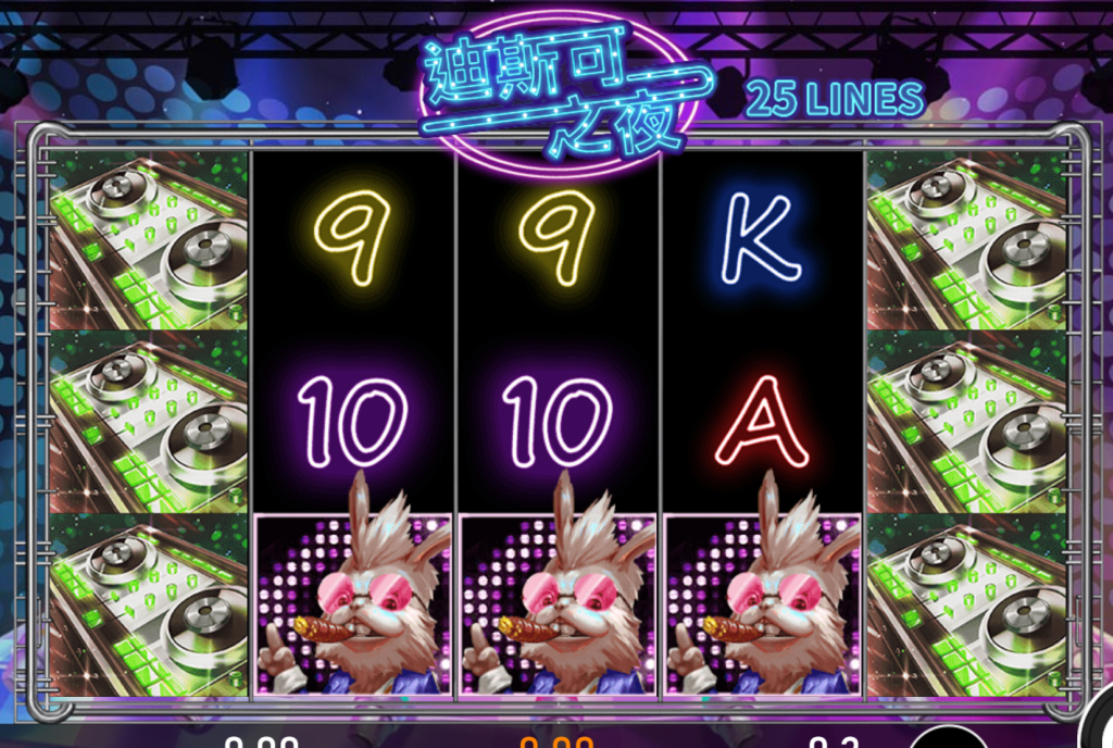 RSG電子-《迪斯可之夜》是一款充滿夜店氛圍與復古霓虹魅力的老虎機遊戲,整體視覺風格極具時尚感。畫面背景營造出熱鬧的舞台與炫光閃爍的派對空間,轉輪圖示則使用大量霓虹字體設計,如9、10、J、Q等符號都發出迷幻光暈,彷彿置身於燈光四射的夜店舞池。