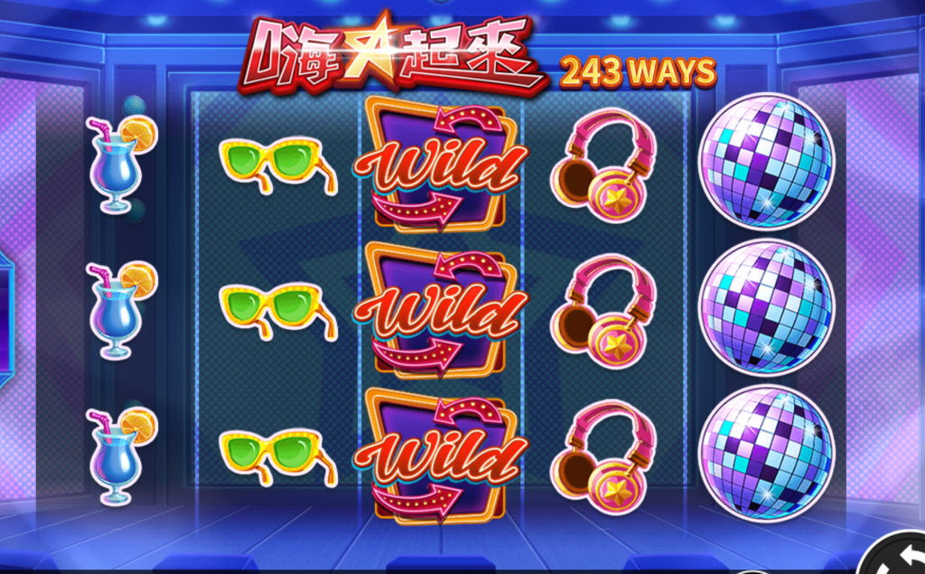 遊戲畫面中可以看到經典派對道具成為符號設計,包括藍色雞尾酒、亮綠墨鏡、粉紅耳機與紫藍鏡球,每一個圖案都繽紛鮮明,勾起人想要跟著節奏「嗨起來」的衝動。中央轉輪出現多個「Wild」字樣,代表高機率觸發連線機會,加上畫面右上角標示的「243 WAYS」,表示全盤皆可連線,無須侷限於固定線條。