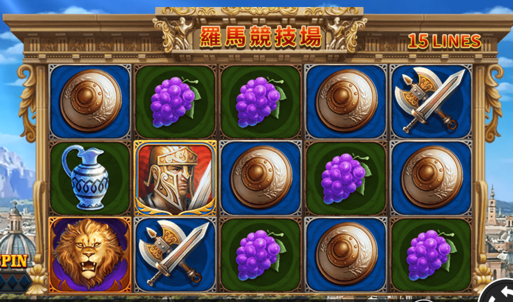 RSG電子-《羅馬競技場》是一款我認為非常具史詩感的機台作品,畫面呈現得既莊嚴又充滿壓迫感,讓人一踏進轉輪畫面就像走入真正的羅馬鬥獸場。轉盤周圍以金雕石柱裝飾、背景是萬人歡呼的古代城邦上空,而轉輪上的每個圖案從士兵、皇冠、獅子到葡萄、陶壺與武器,全都充滿古羅馬元素,讓整體視覺非常一致且沉浸感十足。
