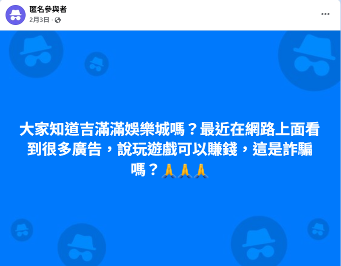 在2025年初,一則看似平凡的Facebook匿名社群貼文,意外掀起了吉滿滿娛樂城的一場「信任危機」。原貼文內容不長,僅僅是用詢問語氣提出:大家知道吉滿滿娛樂城嗎?最近在網路上看到很多廣告,說玩遊戲可以賺錢,這是詐騙嗎?雖然語氣謙和,帶有求證性質,但該貼文卻在短時間內引來大量網友留言,幾乎一面倒地傾向於警覺與質疑,留言內容多半指出「有詐騙嫌疑」、「看過很多受害案例」、「沒看過真的出金」等,甚至有網友直接呼籲「千萬不要碰」。