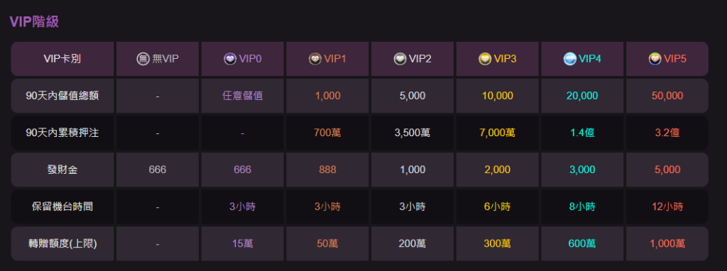 - VIP3~VIP5:針對高資金玩家,享有長時間保留熱門機台、高額發財金與可觀轉贈額度,等同於遊戲內的「富豪玩家」。
