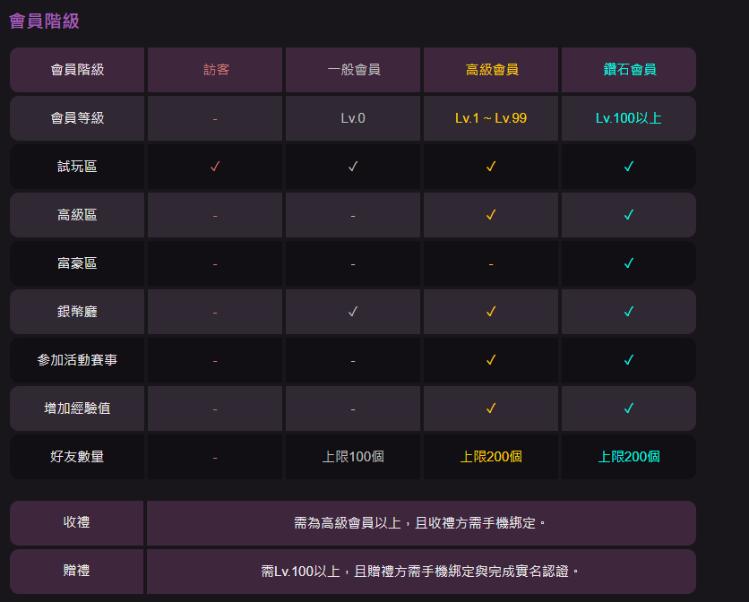 - 訪客與Lv.0會員:僅限試玩,功能受限,無法參與高階活動或社群互動。