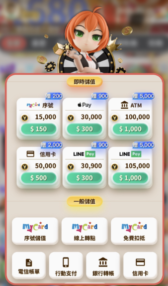 針對不習慣使用即時支付工具的玩家,平台也提供了「一般儲值」功能,主要包括: