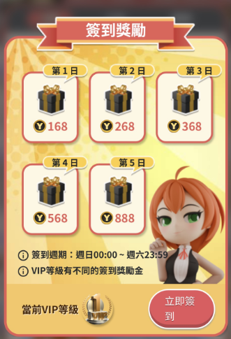 玩家登入遊戲後,只要打開簽到頁面,點擊簽到按鈕即可獲得每日獎勵,從第一天的168點開始,逐日遞增至888點。系統以五日為一輪,將簽到週期明確設定在週日0:00至週六23:59,並標註不同VIP等級對應的簽到獎勵。