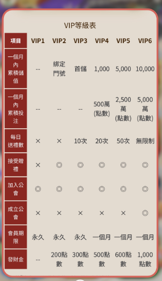 比較特別的是VIP1至VIP3的會員資格為永久制,但從VIP4開始便設有「一個月期限」,若未維持對應儲值,等級恐將降級。這樣的設計促使玩家持續投入消費以保留等級權益,也說明平台偏向打造「活躍儲值社群」的經營導向。