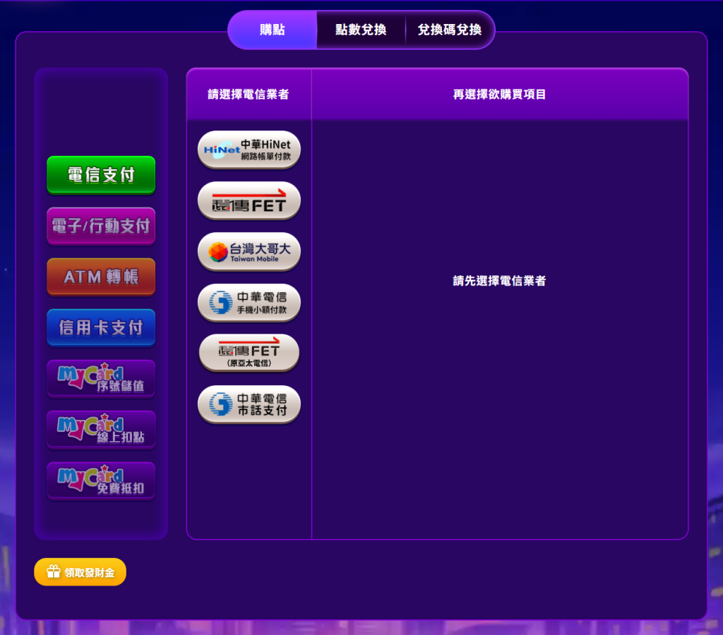 以電信支付為例,玩家可以選擇的業者包括中華HiNet、遠傳FET、台灣大哥大、中華電信手機/市話、以及遠傳固話等,幾乎涵蓋全台主要電信商。這代表玩家僅需透過手機或市話綁定的方式,便能輕鬆進行扣款,且不需要額外註冊第三方支付帳號。這種設計對於偏好快速儲值、或無網銀、無信用卡的用戶相對友善。不過也需要提醒,電信扣款雖然便捷,但通常金額上限有限,且不容易取得退款,若誤操作可能造成扣款糾紛,使用時應特別謹慎。