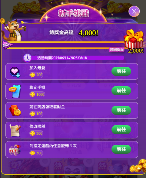 博悅娛樂城設計了名為《新手挑戰》的專屬活動區塊,主要針對剛註冊的新用戶,從活動介面中可以明確看到總獎金可高達4000日金,當中包含至少2000日金的「進階獎勵」,此活動時間為期一週。整體任務包含六大項目,從簡單的「加入最愛」送200日金,到實質性的「綁定手機」即贈1000日金,再到「前往商店領取發財金」與「修改暱稱」各可得100與200日金,最後是要求玩家實際參與遊戲在指定遊戲內旋轉五次,即可再獲得500日金。這樣的設計看似簡單,卻成功融合了社交導向、帳號安全、行為導引與遊戲實際參與的四大核心目的。
