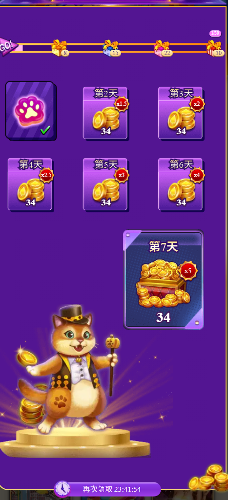 除了針對新戶的初期任務,博悅娛樂城也設計了「每日簽到」制度,這套系統採取連續獎勵遞增機制,從第一天開始,玩家只要每日登入並點擊簽到,即可獲得基礎點數,而隨著簽到天數增加,獎勵倍數也逐漸放大。從畫面可見,第1天簽到獎勵為34日金、第2天為1.5倍、第3天為2倍,以此類推,第5天為3倍、第6天為4倍,到第7天甚至達到5倍,意味著原本僅34日金的獎勵到了第7天將提升為170日金。這種階梯式激勵不僅能提升玩家每日開啟平台的動力,也間接培養玩家對平台的使用習慣與依賴感。