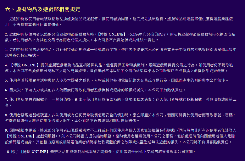 首先在規則第一點中,平台明確指出「遊戲中開放使用者帳號以點數兌換虛擬物品或遊戲幣,僅供娛樂使用,無任何實質價值」。這條規則可說是所有線上娛樂平台的核心原則,即平台內流通的點數或金幣不具法定貨幣功能,也不能等同於現實財產。
