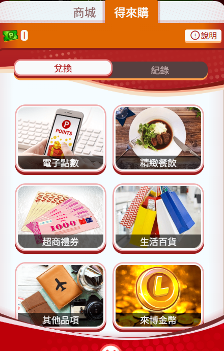 來博娛樂城獨立設計了一套「得來購」兌換平台,為玩家提供將遊戲金幣轉換為實體商品的管道。進入得來購頁面後,可以清楚看到兌換類別劃分成六大項目,整體介面直覺、分類明確,提供多樣生活化選擇。