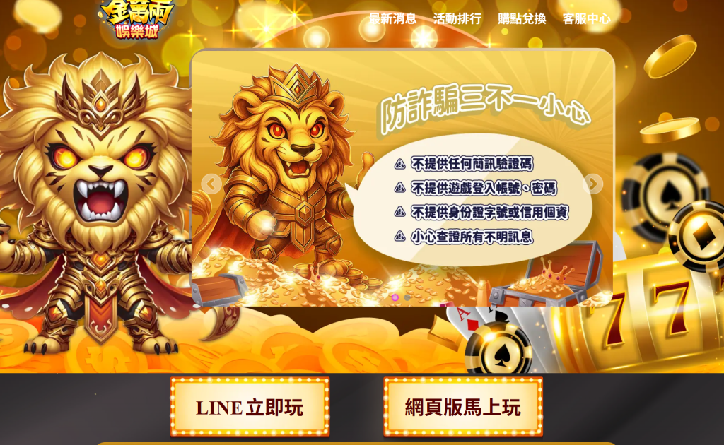 金萬兩娛樂城在首頁就主動標示防詐資訊,是目前少數以「使用者資訊安全」為亮點的娛樂平台之一。其提醒內容不僅限於口號式標語,而是明確列出三大禁區並輔以獅子角色強化印象。