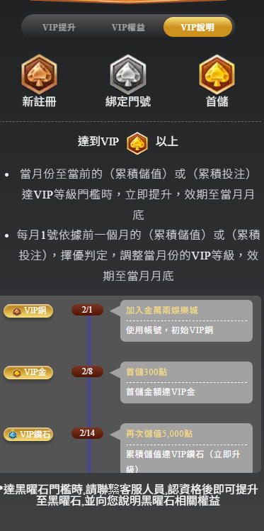 金萬兩娛樂城的VIP制度設計,基本上是依照「月度儲值」與「月度投注」兩個指標作為升級與續級條件。從玩家完成註冊開始,會依序進入以下等級: