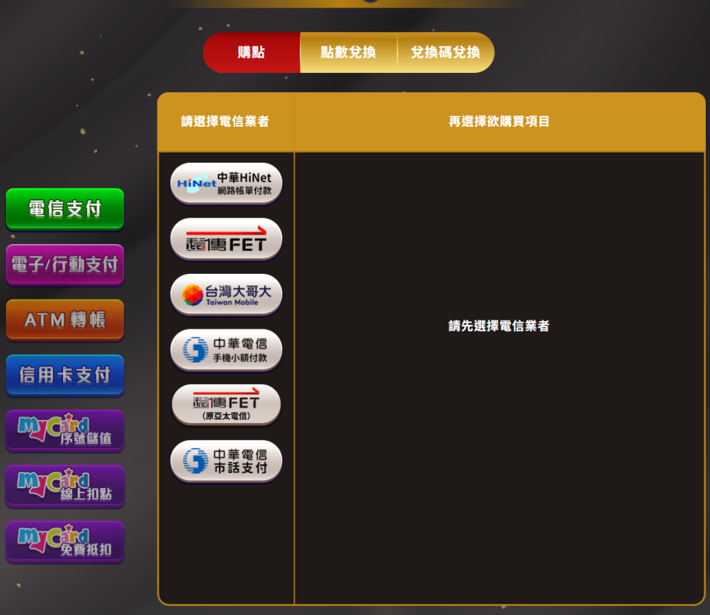 電信支付是金萬兩娛樂城的重點儲值管道之一,支援以下幾大電信業者: